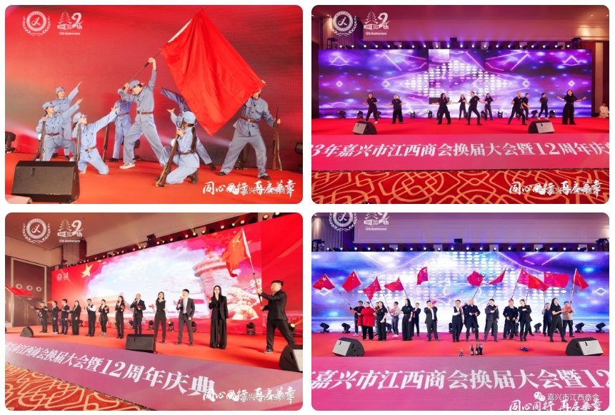 当天晚上,在嘉宴中心红船厅隆重举行会议第二阶段的庆典活动——“同心同行,再启华章”嘉兴市江西商会十二周年暨2023年会庆典晚宴。整个红船大厅贵宾云集,高朋满座,欢庆喜乐,春意浓浓,呈现出一幅生机勃勃、欣欣向荣的美丽画卷!宴会在一曲《曙光》情景剧表演中拉开序幕,全体人员观看《嘉兴市江西商会十周年宣传片》后,王小癸会长发表热情洋溢的致辞,浙江省民政厅基层政权和社区治理处二级调研员秦新春、浙江省江西商会会长程栋分别致辞。紧接着,精彩纷呈的文艺节目,间隔着一轮又一轮抽奖活动,让与会人员激情高昂,意犹未尽。尤其是《江西商会会歌》和《歌唱祖国》节目,全场互动,大家手挥红旗,放声歌唱,璀璨的灯光映照全场,把整个宴会推向高潮!整场文艺表演还有《十送红军》舞蹈、《南湖望月》女声独唱、《在那桃花盛开的地方》女声独唱等曲目,这些节目的安排体现了赣嘉两地共同的红色根脉和红色文化,都深得观众们的喜爱和好评。尤其是会员们自编自演的几个节目,广大会员因受到观众们的赞不绝口而深感自豪!